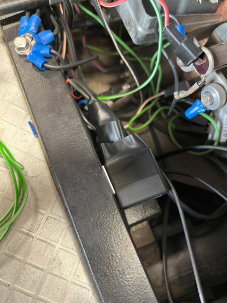 Das Relais mit Piepser habe ich dann mit einer Steckdosenleiste an der Querstange hinter der Armaturenbrettabdeckung (vom Motorraum aus gesehen) befestigt. Die Lima hat eine Bimetallsicherung zur Absicherung der Hauptscheinwerfer (in meinem Fall an der Außenwand der Fahrerseite unter dem Armaturenbrett), von der ich die Stromversorgung beim Einschalten der Beleuchtung bekommen habe. Man kann den Strom auch von der Armaturenbrettbeleuchtung beziehen. Das hat nur einen Nachteil: Wenn das Standlicht eingeschaltet ist, hat es auch Strom und der Piepser spricht an.