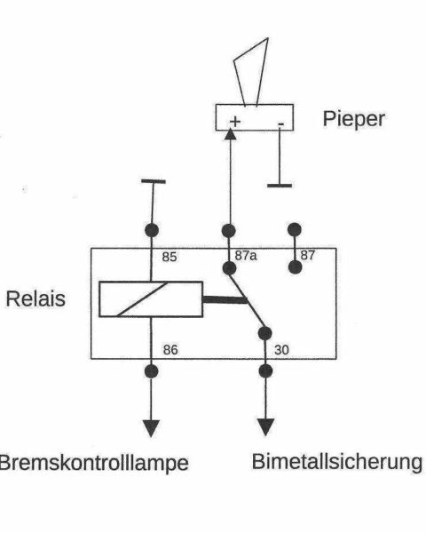 Ich habe ein Standardrelais von Bosch und einen Piepser von Amazon verwendet (Active Piezo Buzzer 3-14V…). Wenn die Zündung eingeschaltet ist, d.h. die Bremskontrollleuchte leuchtet, ist das Relais geöffnet und der Piepser hat keinen Strom. Wenn die Zündung aus ist, wird der Kontakt zum Piepser geschlossen und wenn die Hauptscheinwerfer noch eingeschaltet sind, wird der Piepser bestromt und ertönt.